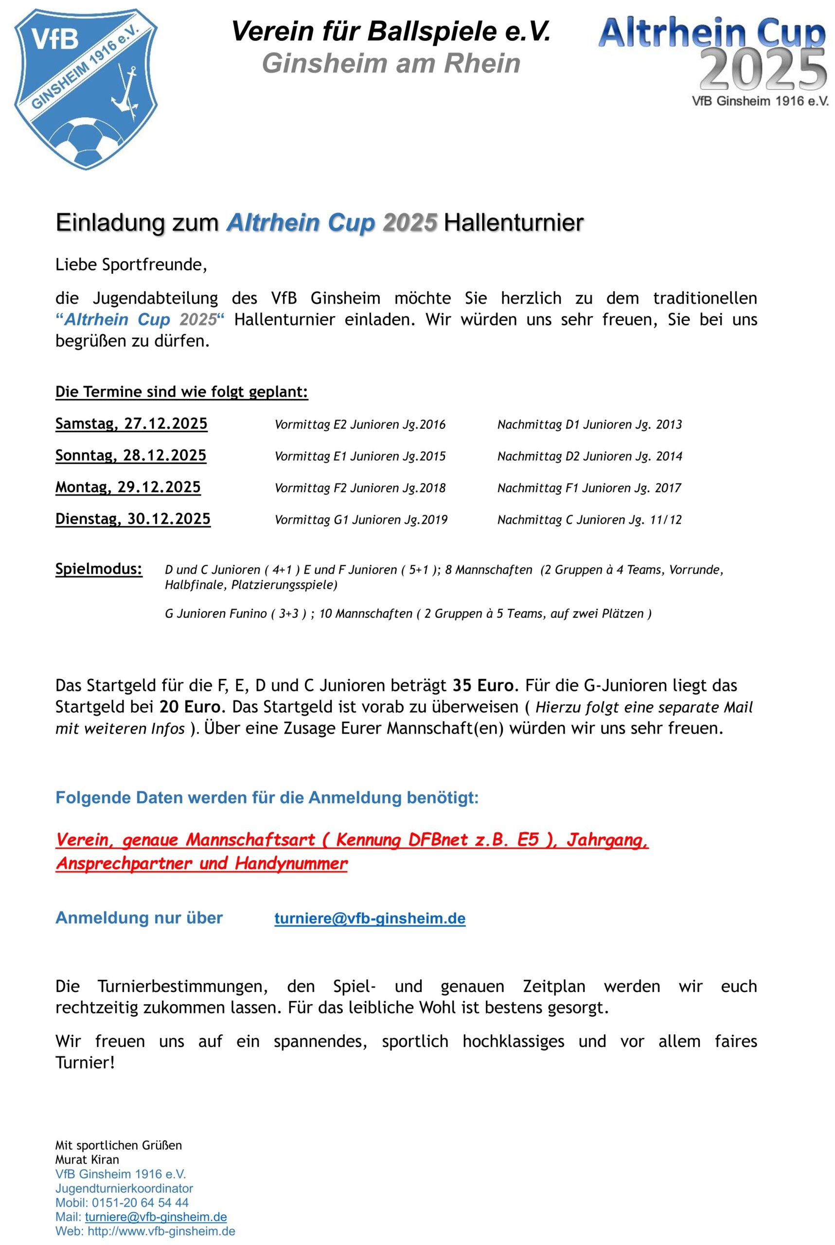 die Jugendabteilung des VfB Ginsheim möchte Sie herzlich zu dem traditionellen „Altrhein Cup 2025“ Hallenturnier einladen. Wir würden uns sehr freuen, Sie bei uns begrüßen zu dürfen.